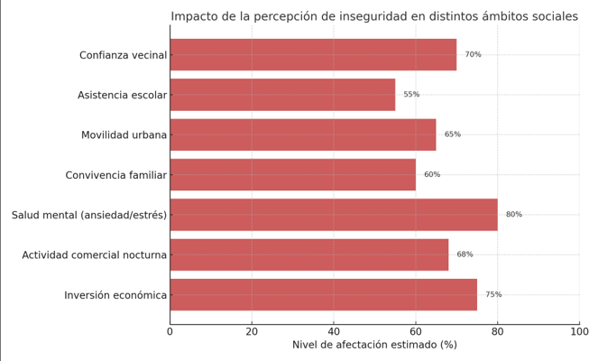 La siguiente gráfica muestra el nivel de impacto estimado que la percepción de inseguridad tiene en distintas áreas clave: salud mental, actividad económica, escolaridad, convivencia social y confianza comunitaria.